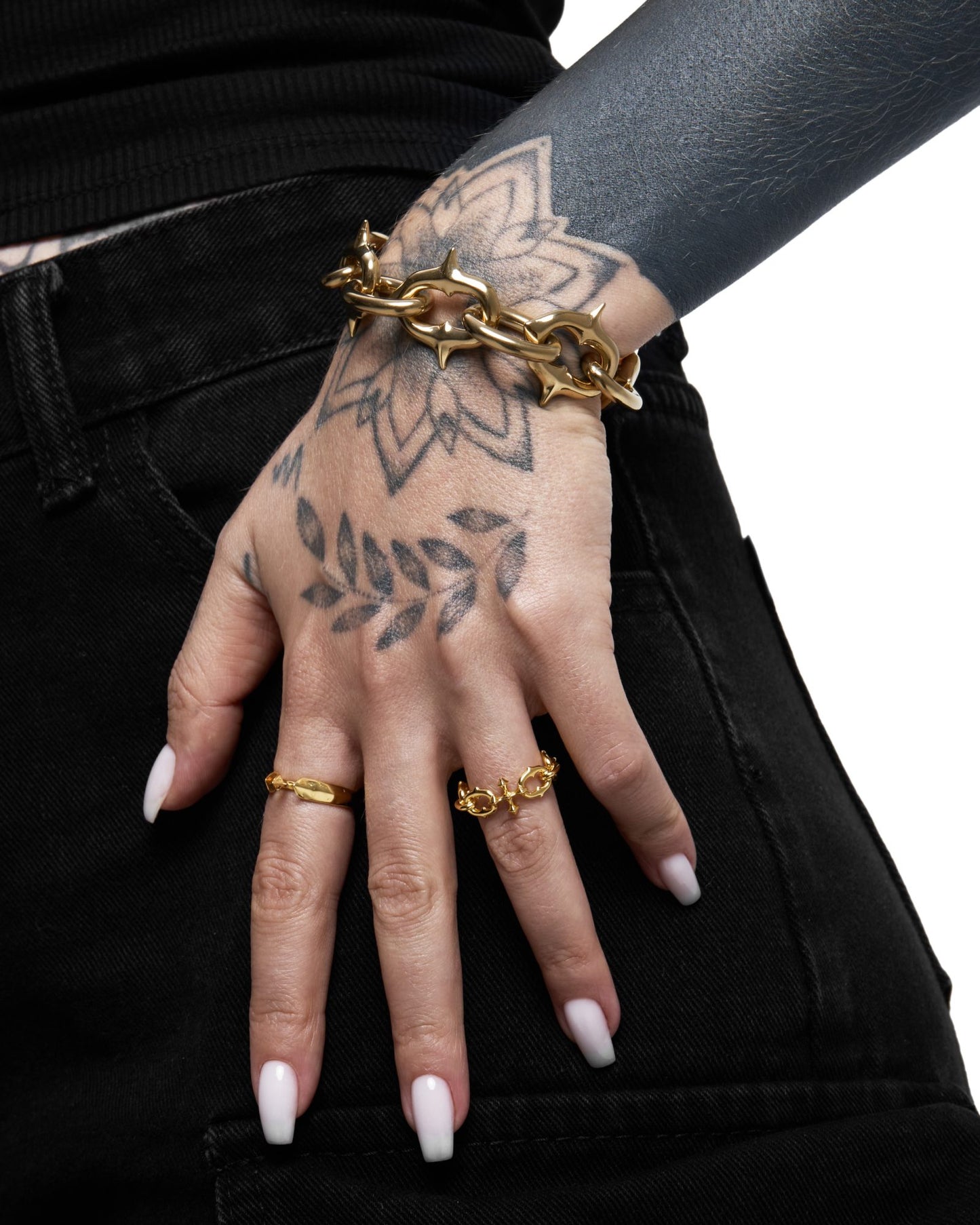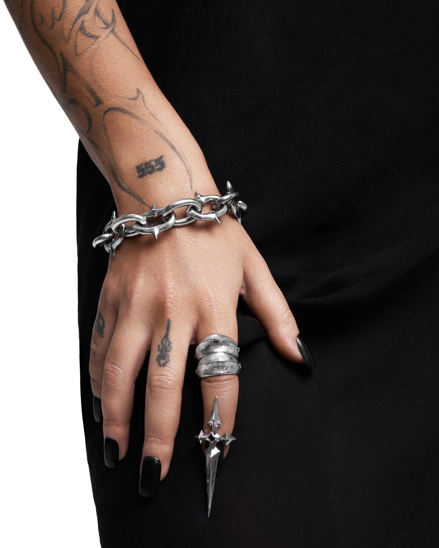 A polished chain bracelet featuring sculpted spikes abstracted from our iconic Sigil cross. Spikes are polished down to stay soft against the skin. Spikes are positioned on alternating links, facing outward and away from the skin—balancing brutalist forms with maximum comfort. Forged entirely from 316L surgical grade stainless steel for all genders and expressions. Complete your look with other jewelry from the UNHOLY GRAIL series.