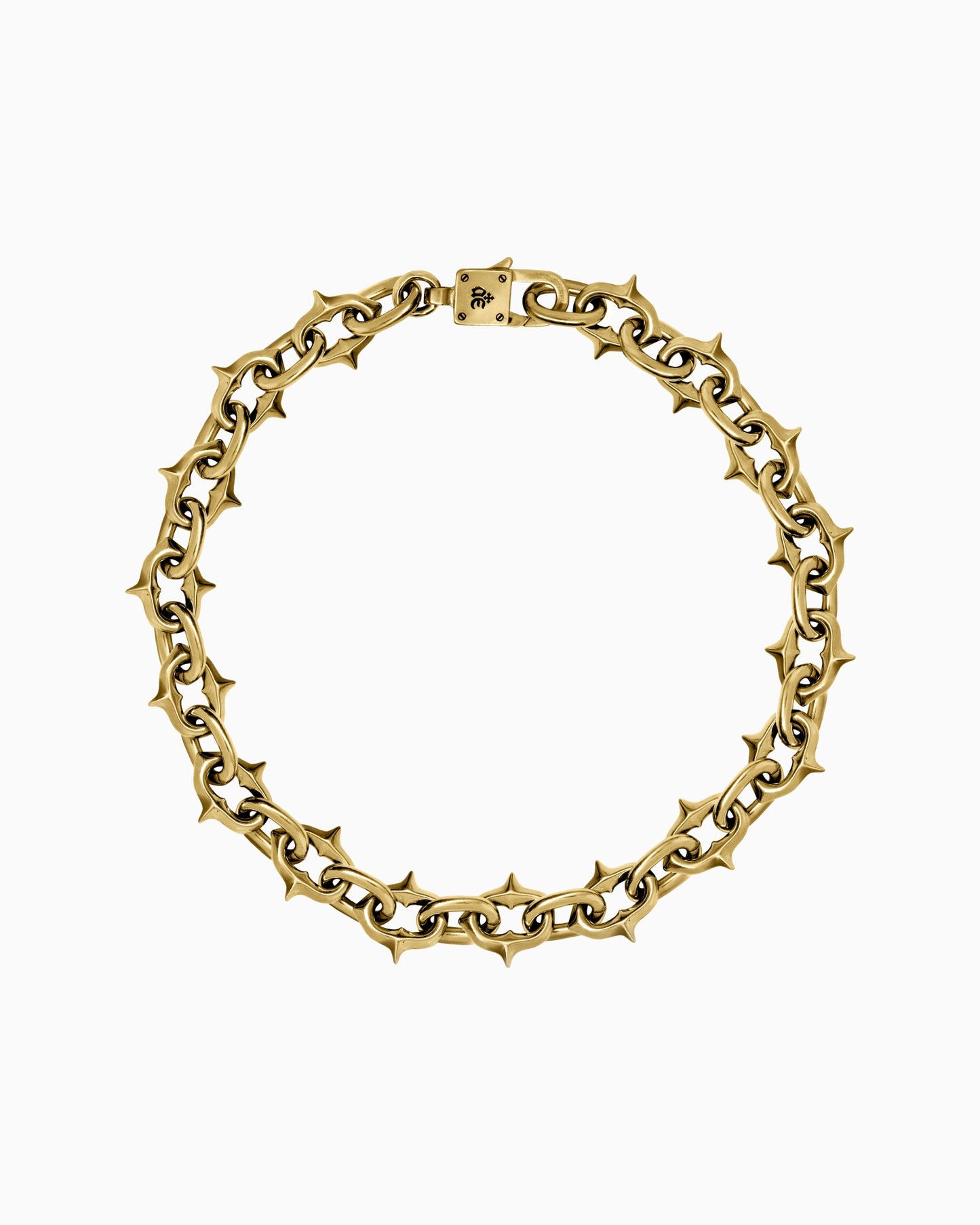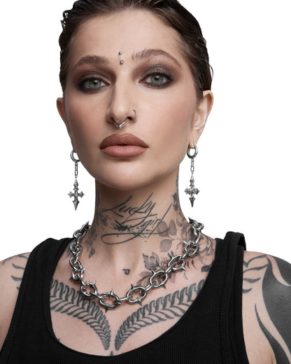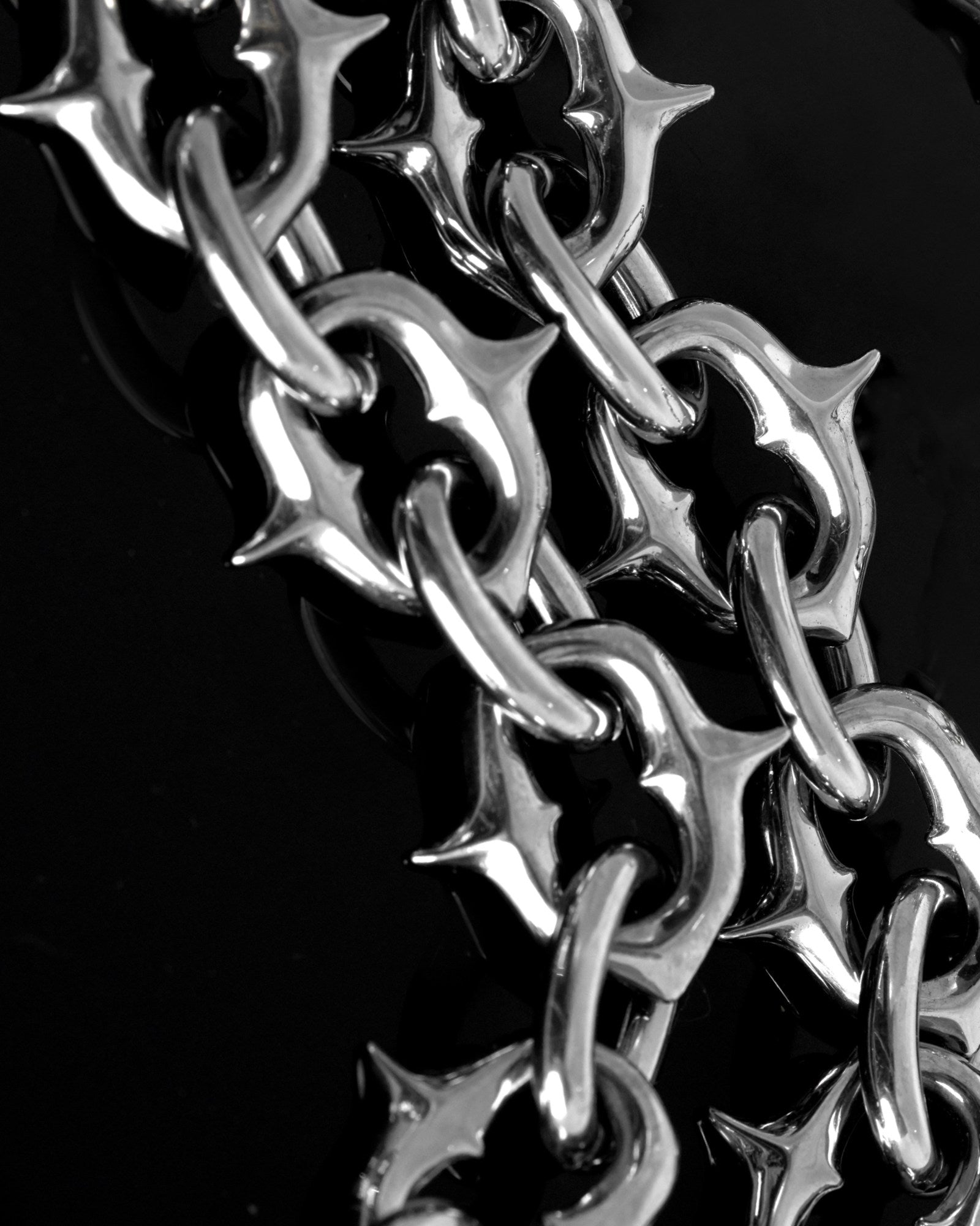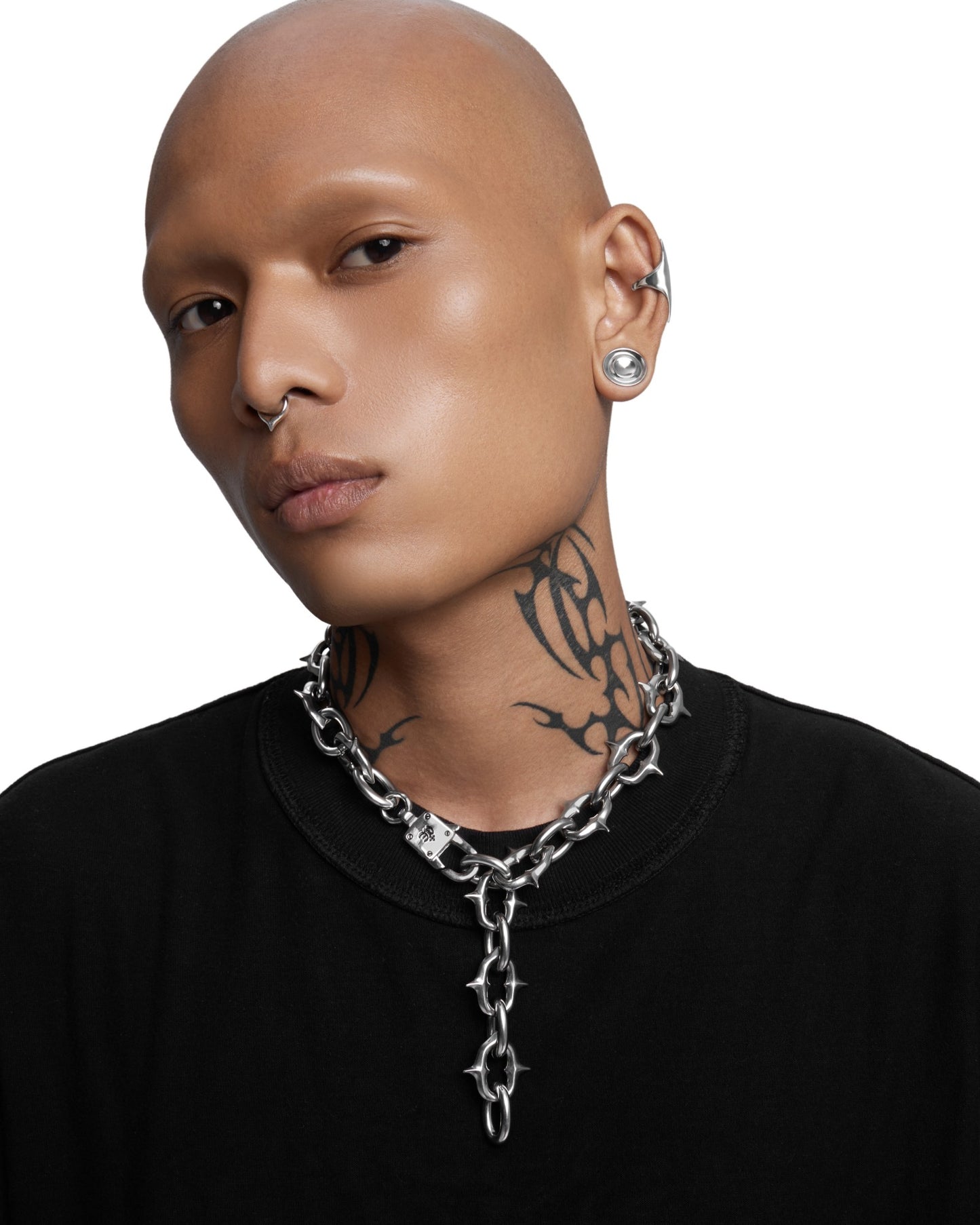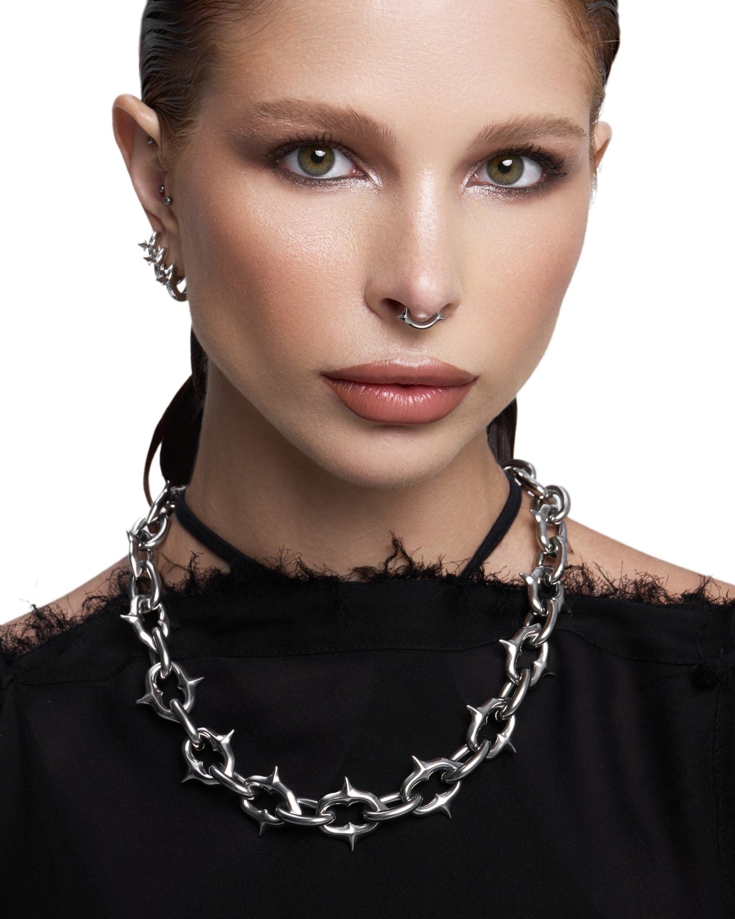 A polished, adjustable chain necklace featuring sculpted spikes abstracted from our iconic Sigil cross. Spikes are sculpted and polished down for tapered silhouettes that stay soft against the skin. Spikes are positioned on alternating links, facing outward and away from the skin—balancing brutalist forms with maximum comfort. Features multiple ways to wear—style it longer for a bane-bound hang, as a choker for a draconic edge, or leashed for beast-born tethers. Forged entirely from 316L surgical grade stainless steel for all genders and expressions. Complete your look with other jewelry from the UNHOLY GRAIL series.