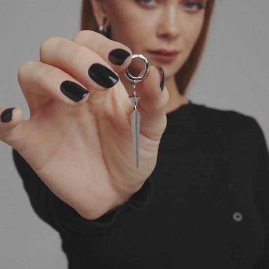 Hangers of a tapered spearhead with a weathered finish, suspended from a spindled star. Made entirely from stainless steel. Shop the SABER series.