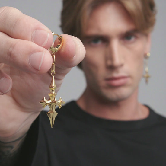 High-polished dangle earrings featuring a crossblight flail of spindled spikes, derived from the Ask & Embla gothic cross logomark. Forged entirely from 316L surgical grade stainless steel for all genders and expressions. Complete your look with other jewelry from the AELEGORIA series.