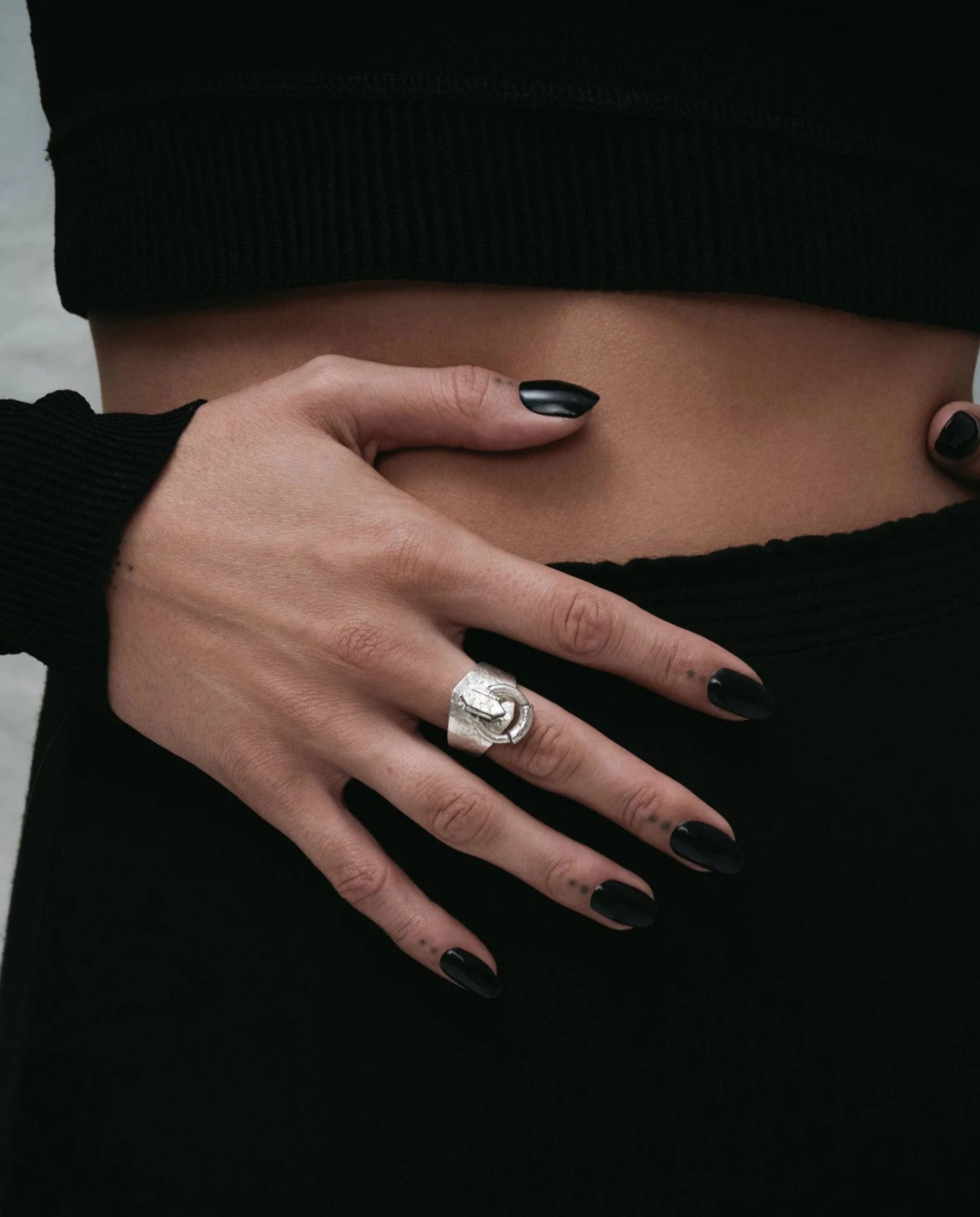 A 925 sterling Silver ring with a moveable door knocker detail hinged at its centre. Hand-finished in demi-fine detail and tooled for tactile interactions. Forged for all genders and expressions.
