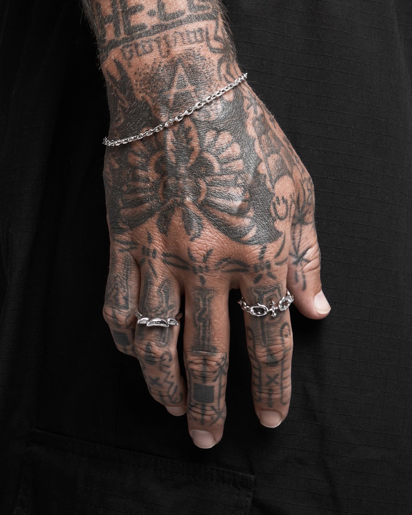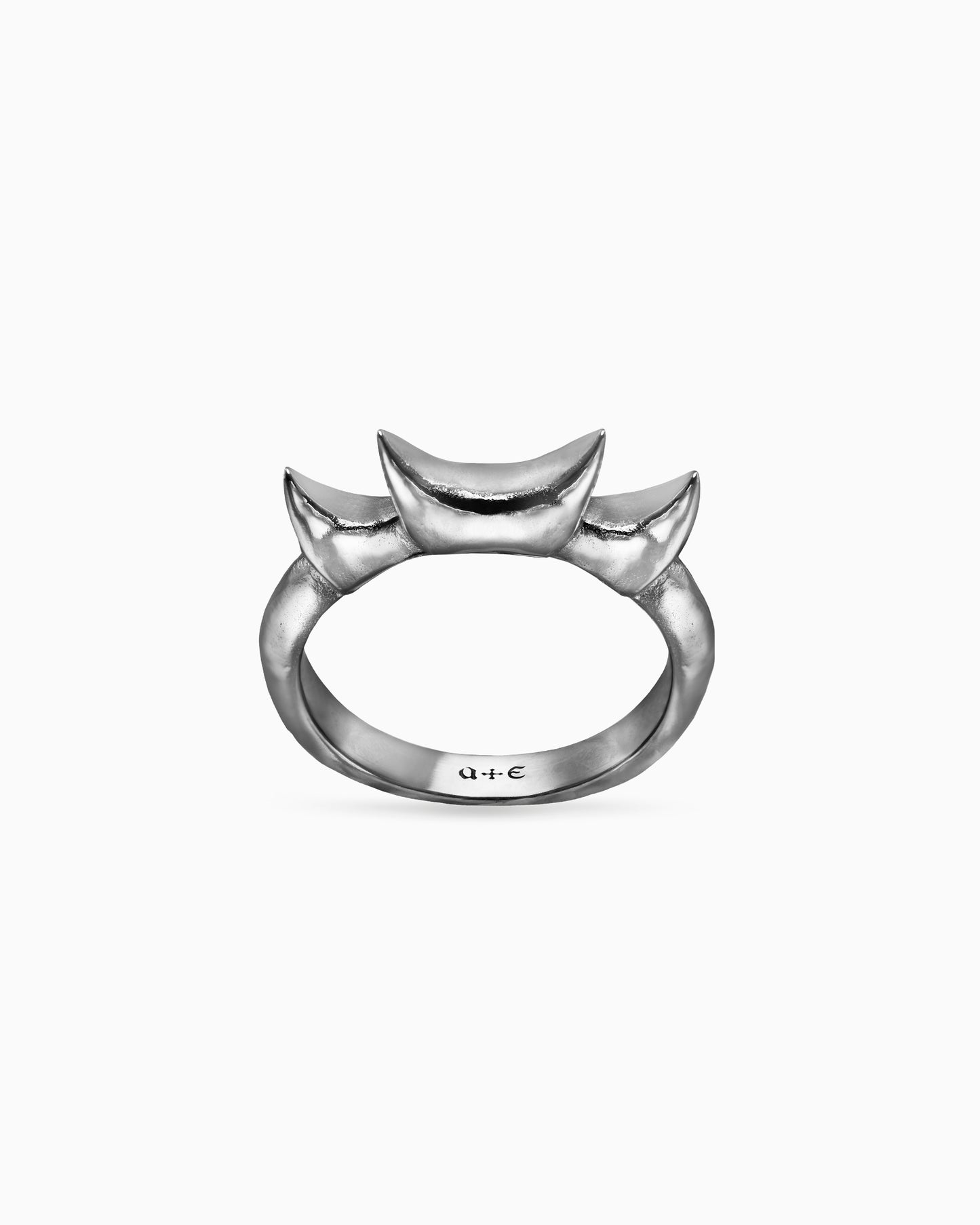 A demi-fine 925 sterling silver ring featuring four curved peaks at its crest. Finished with a timeworn texture and crafted for a versatile fit that flatters every finger, from pinky to thumb. Wear solo for singular impact, or stack 2 to 3 for a snarled, spiral statement. Forged for all genders and expressions. Complete your look with other jewelry from the FORSAKEN series.