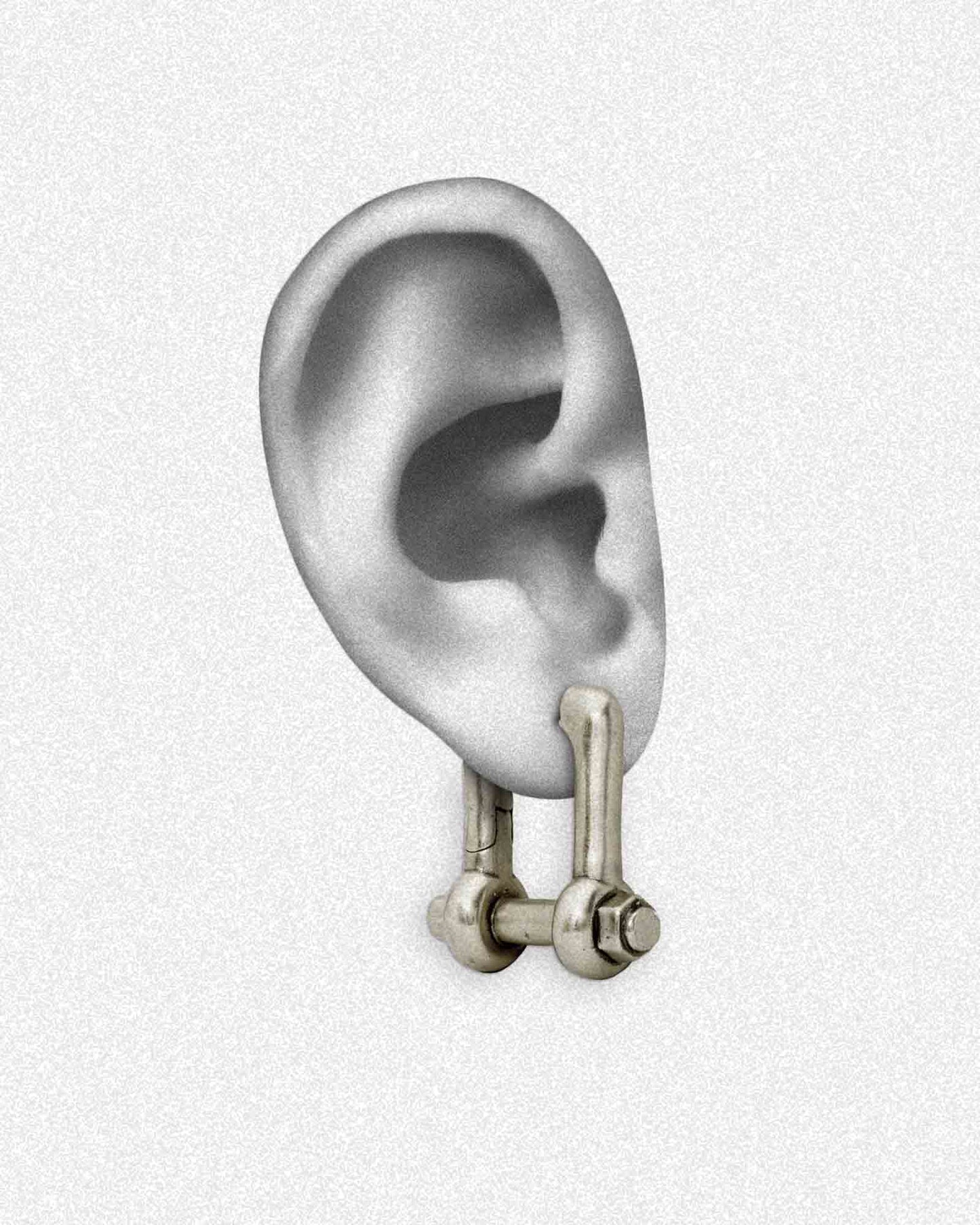 Components biomechanised for human wear, melded to soften in chrome contours to forge your own metallurgical expressions. Hoop earrings of a bolt hinged on torque nuts to form a handle. Forged for all genders and expressions. Ear posts made from 925 Silver - kinder to sensitive skin.
