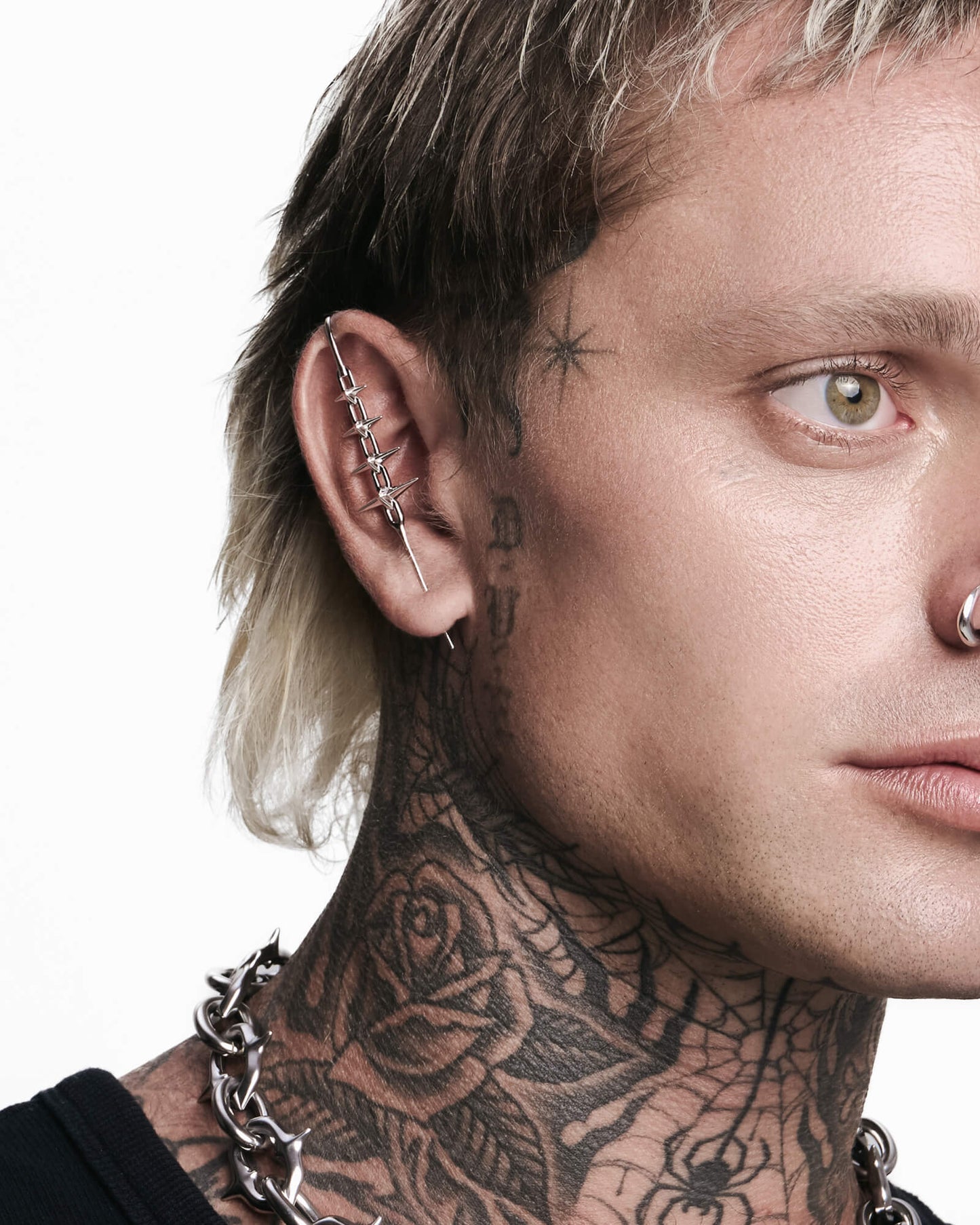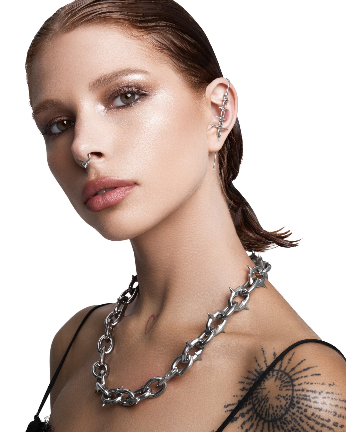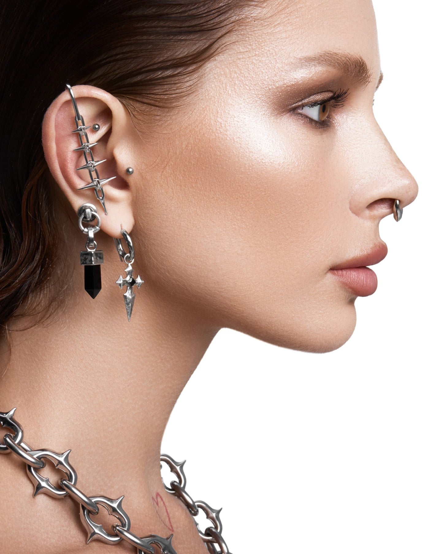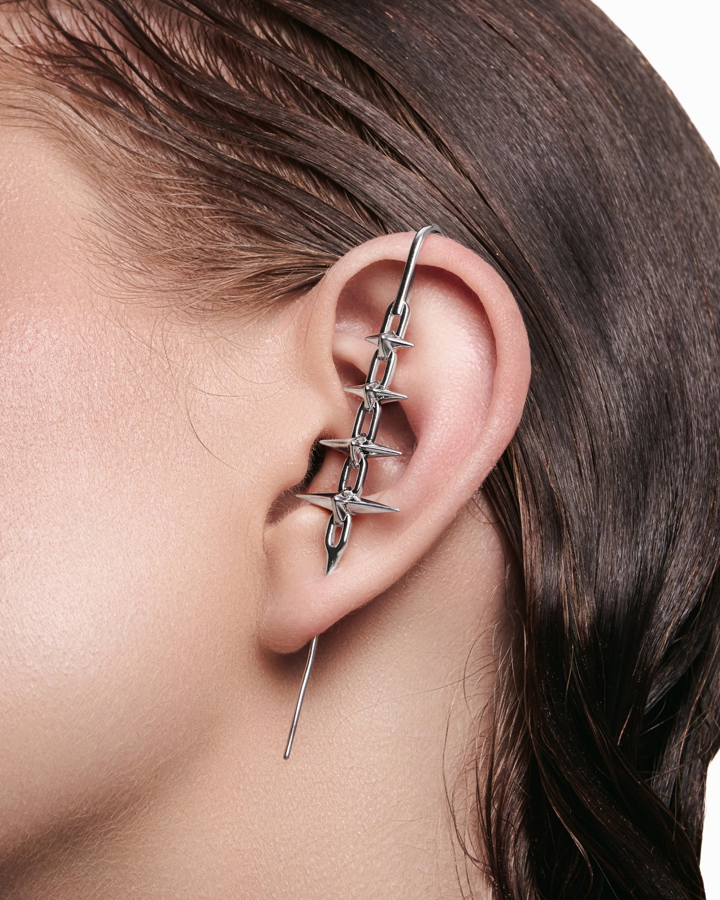 A 925 sterling silver pin cuff earring featuring bound links and tapered spikes. Designed to thread through your lobe piercing and clasp over your helix. Adjustable with care—gently bend the cuff to loosen or tighten the fit over your helix. Avoid repeated adjustments to preserve its durability. Features mirrored details and can be worn interchangeably on either ear. Made for all genders and expressions. Complete your look with other jewelry from the FORBIDDEN series.