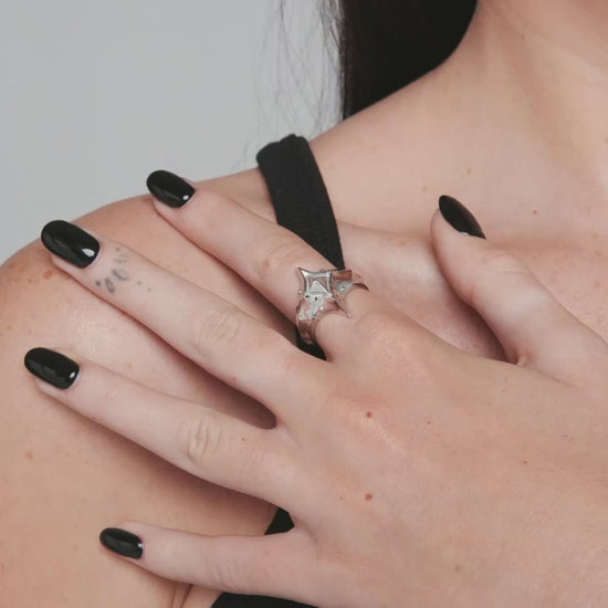 A demi-fine, 925 sterling silver ring featuring a faceted spindled star. Shop the Meg Murayama x Ask & Embla Duskrider series.