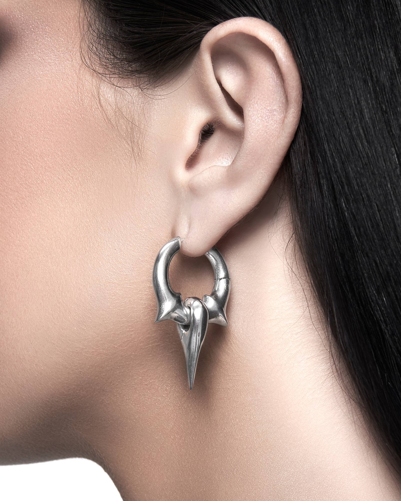 Modular earrings featuring a removable hanging spire. Keep the spire on for pointed statements, or wear it without for subtler silhouettes. Attach the spire to any chain for a bold, minimalist pendant.