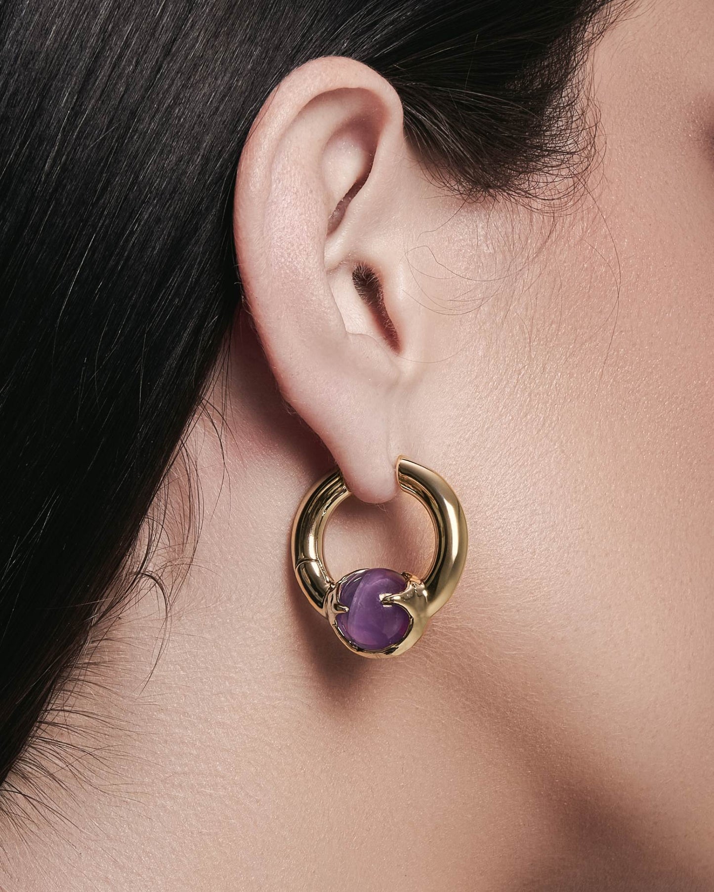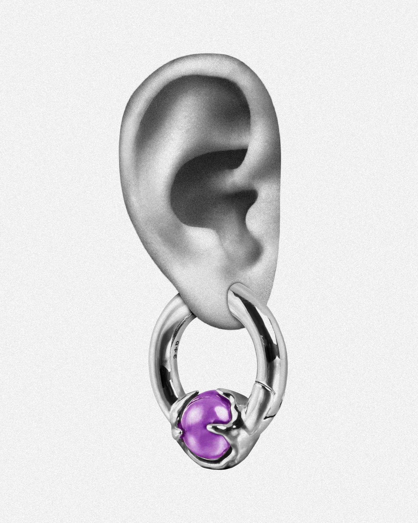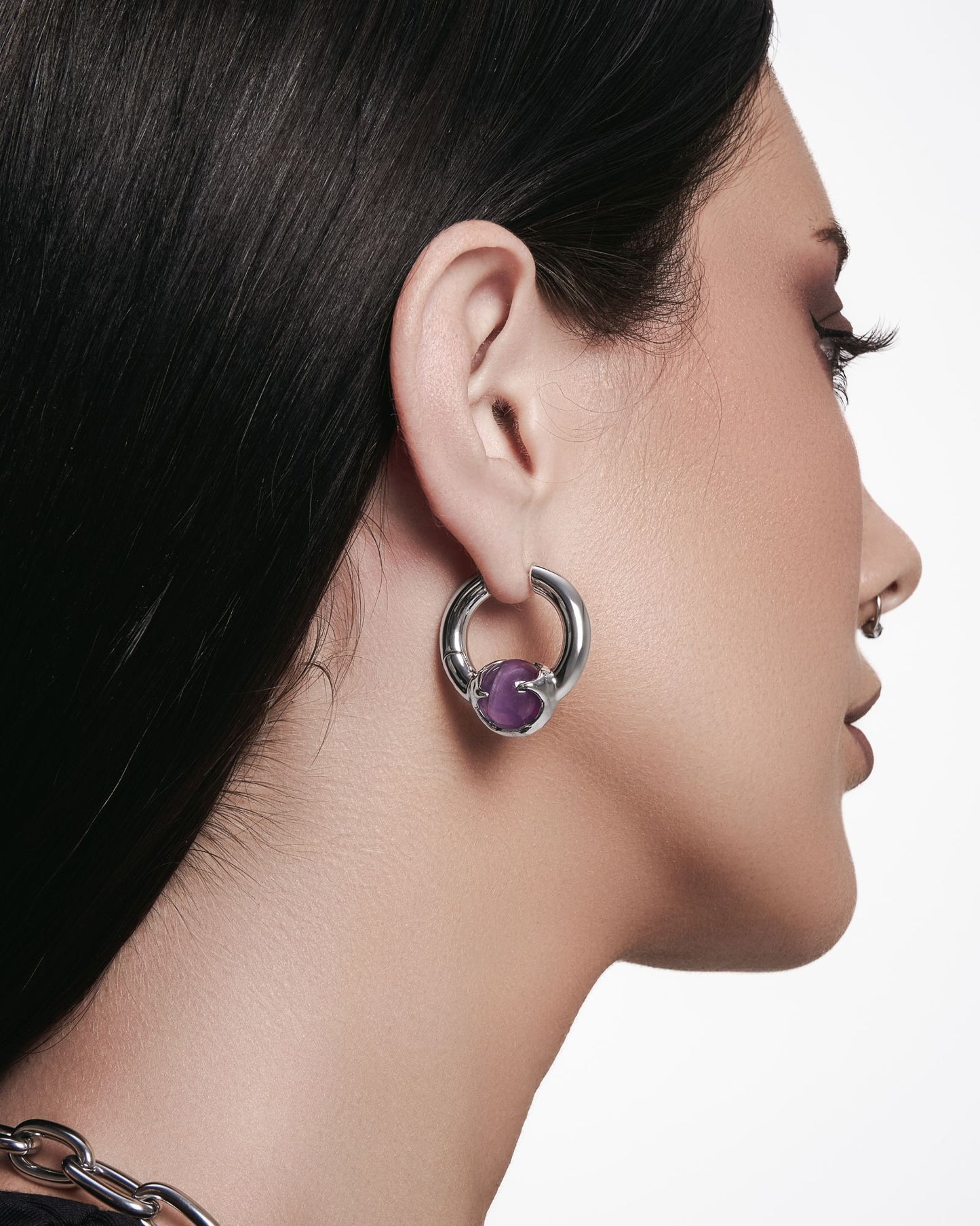 Hoop earrings with a spherical amethyst gemstone ensnared by molten tendrils. Forged for all genders and expressions. Ear posts made from 925 Silver - kinder to sensitive skin. Complete your look with other jewelry from the Nebula series.