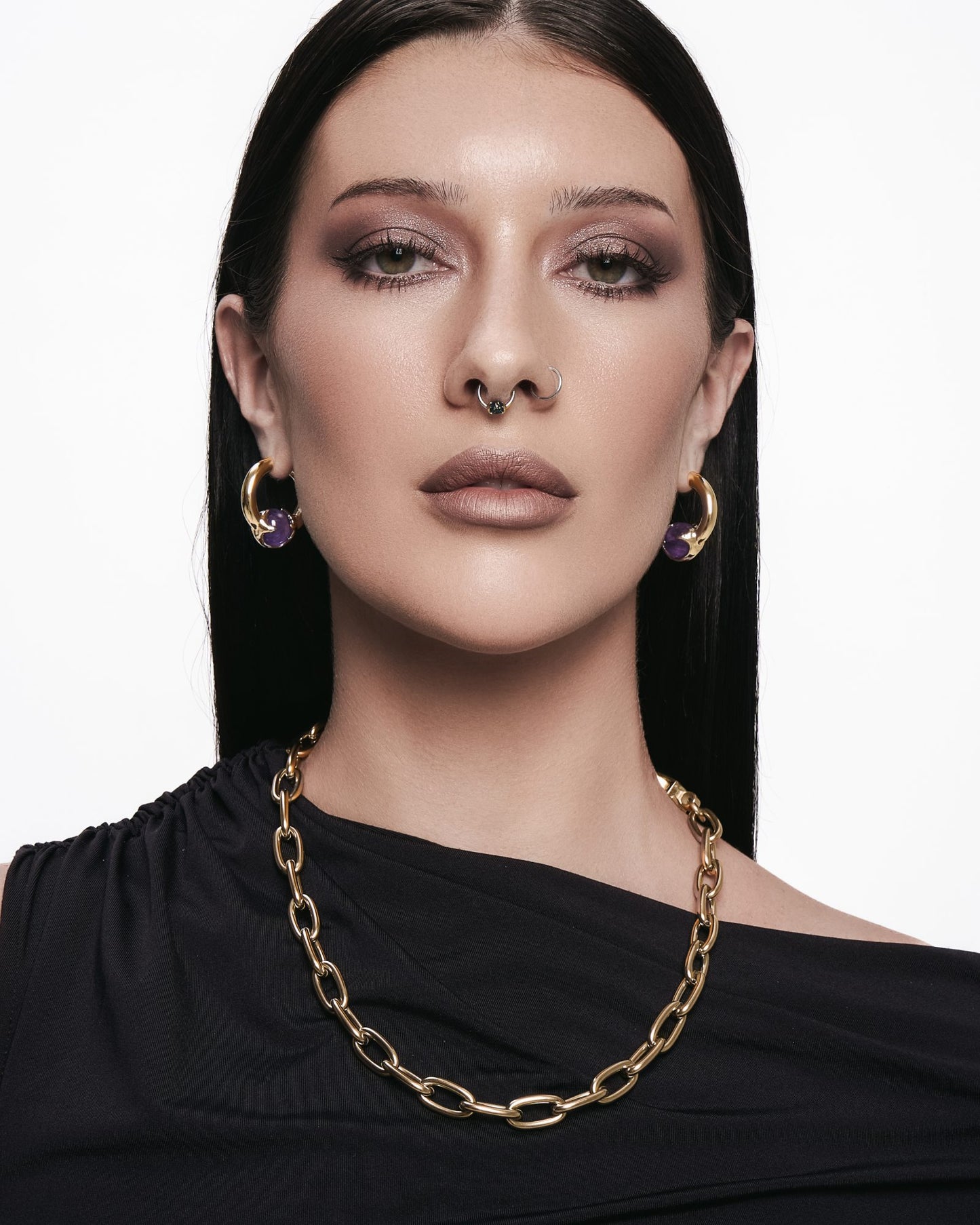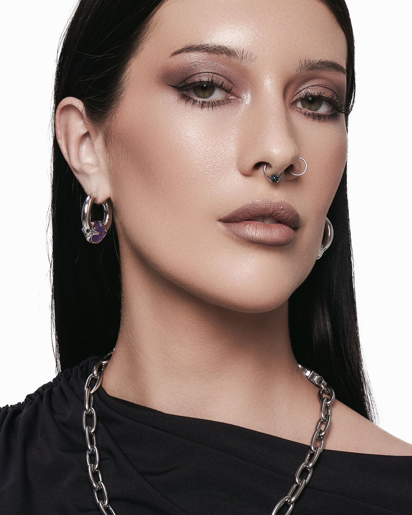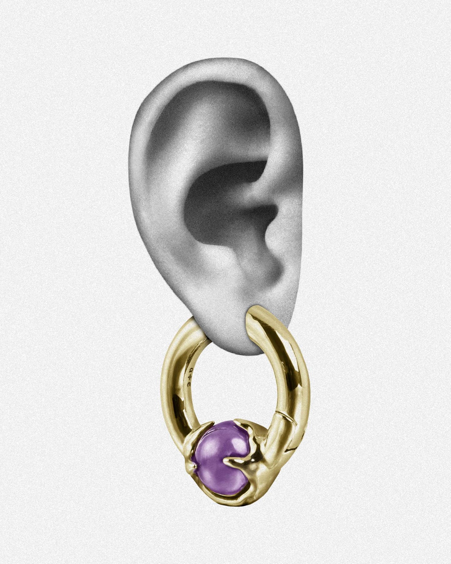 Hoop earrings with a spherical amethyst gemstone ensnared by molten tendrils. Forged for all genders and expressions. Ear posts made from 925 Silver - kinder to sensitive skin. Complete your look with other jewelry from the Nebula series.