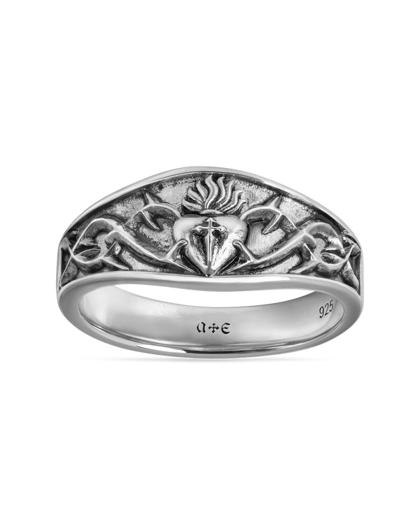 Meet the Sacrament Claddagh ring and the Sacrament Claddagh Band ring. Inspired by the traditional Celtic Claddagh ring, our modern take features our Sacred Heart icon, sculpted to seal your devotion in everlasting silver.