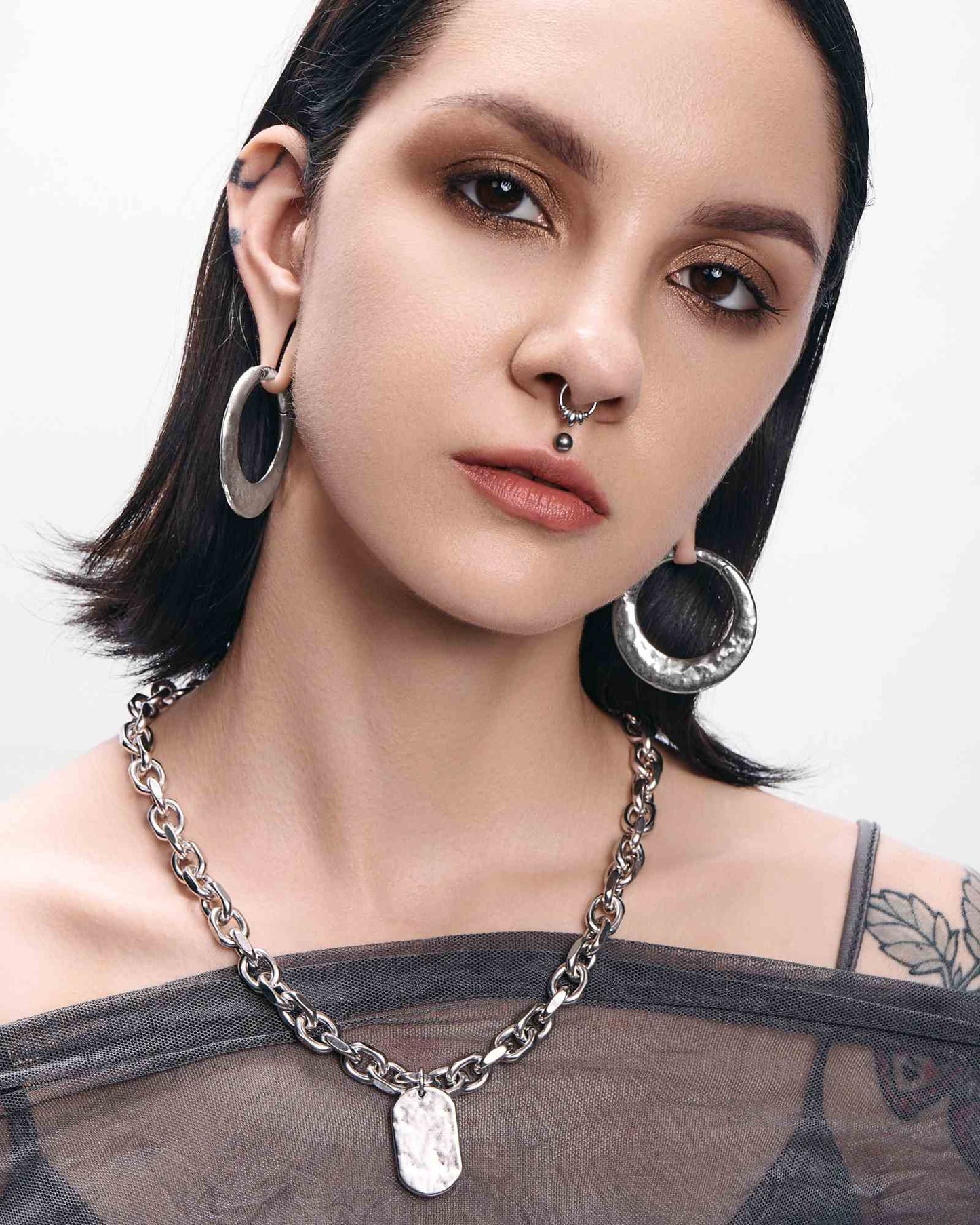 High-polished and hand-hammered hoop hangers armoured and amplified with a crescent moon curve.