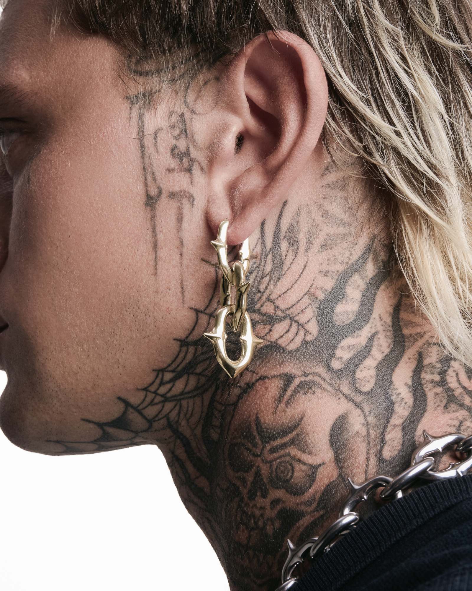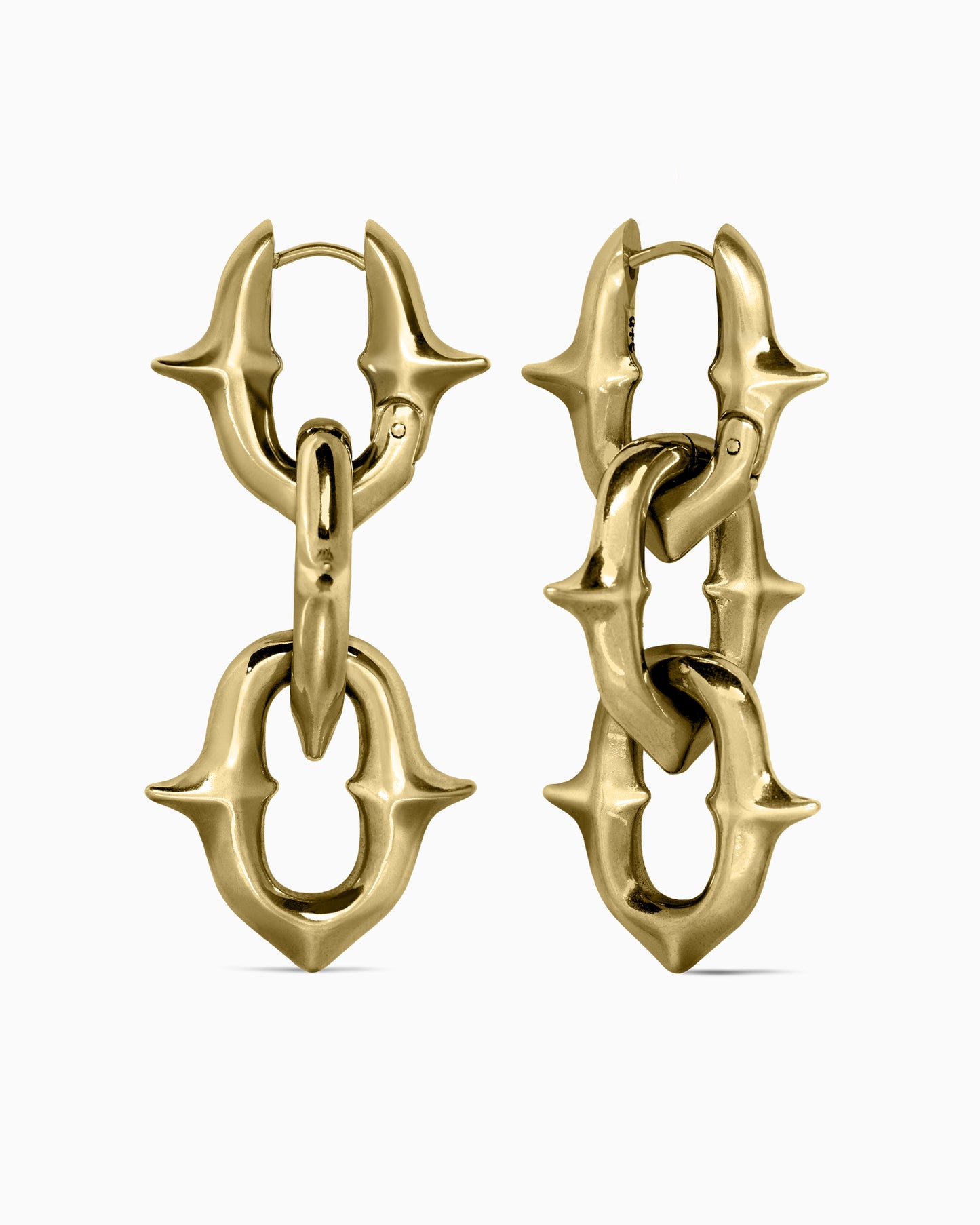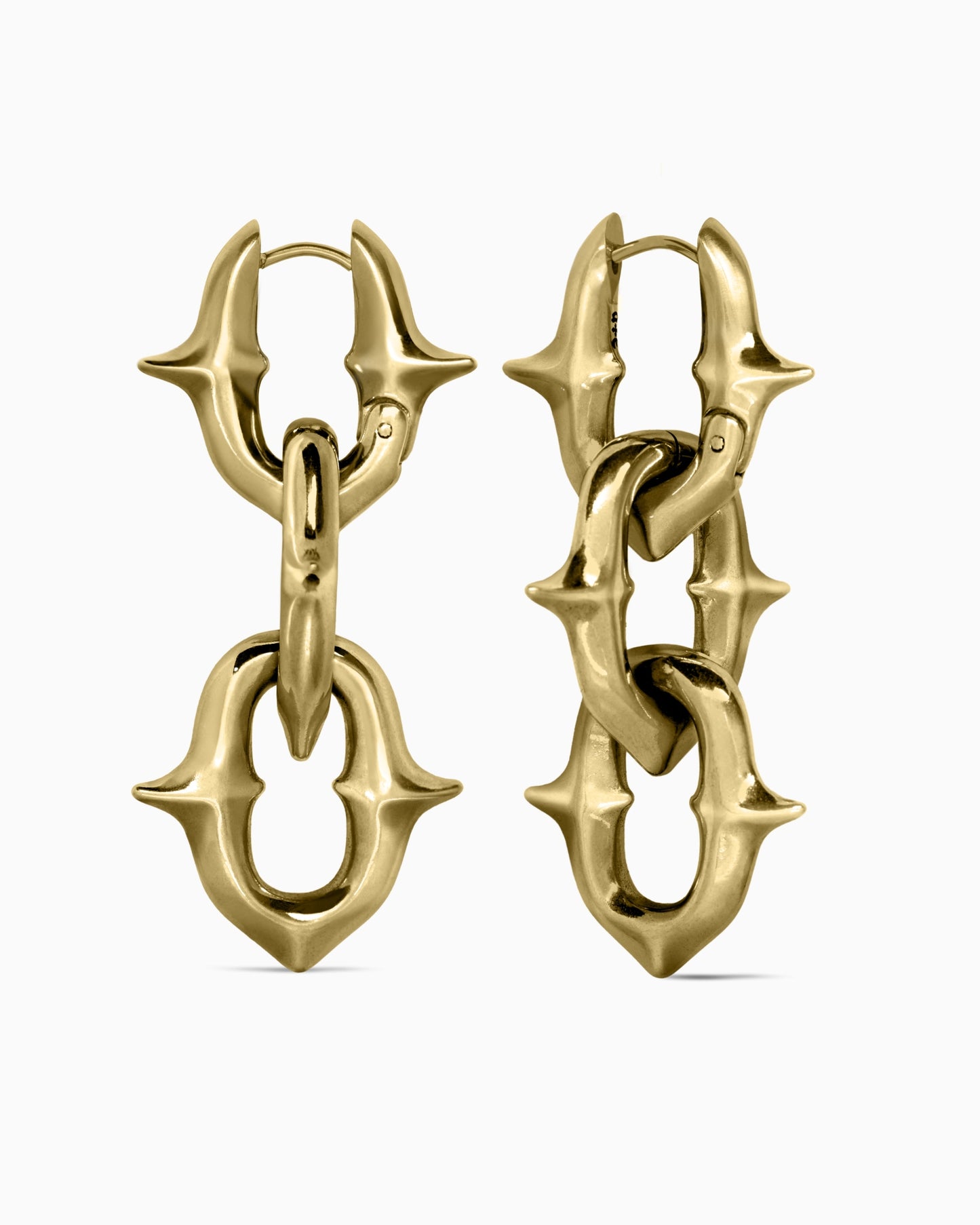 Modular, high-polished chain earrings featuring removable links. Each chain bears sculpted spindled spurs abstracted from our iconic Sigil cross. Adorn it armoured with all three chain links, or remove them to shift from defiance to surrender. Forged from 316L surgical-grade stainless steel, these earrings are designed for all genders and expressions. Complete your look with other pieces from the UNHOLY GRAIL series.