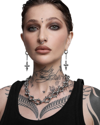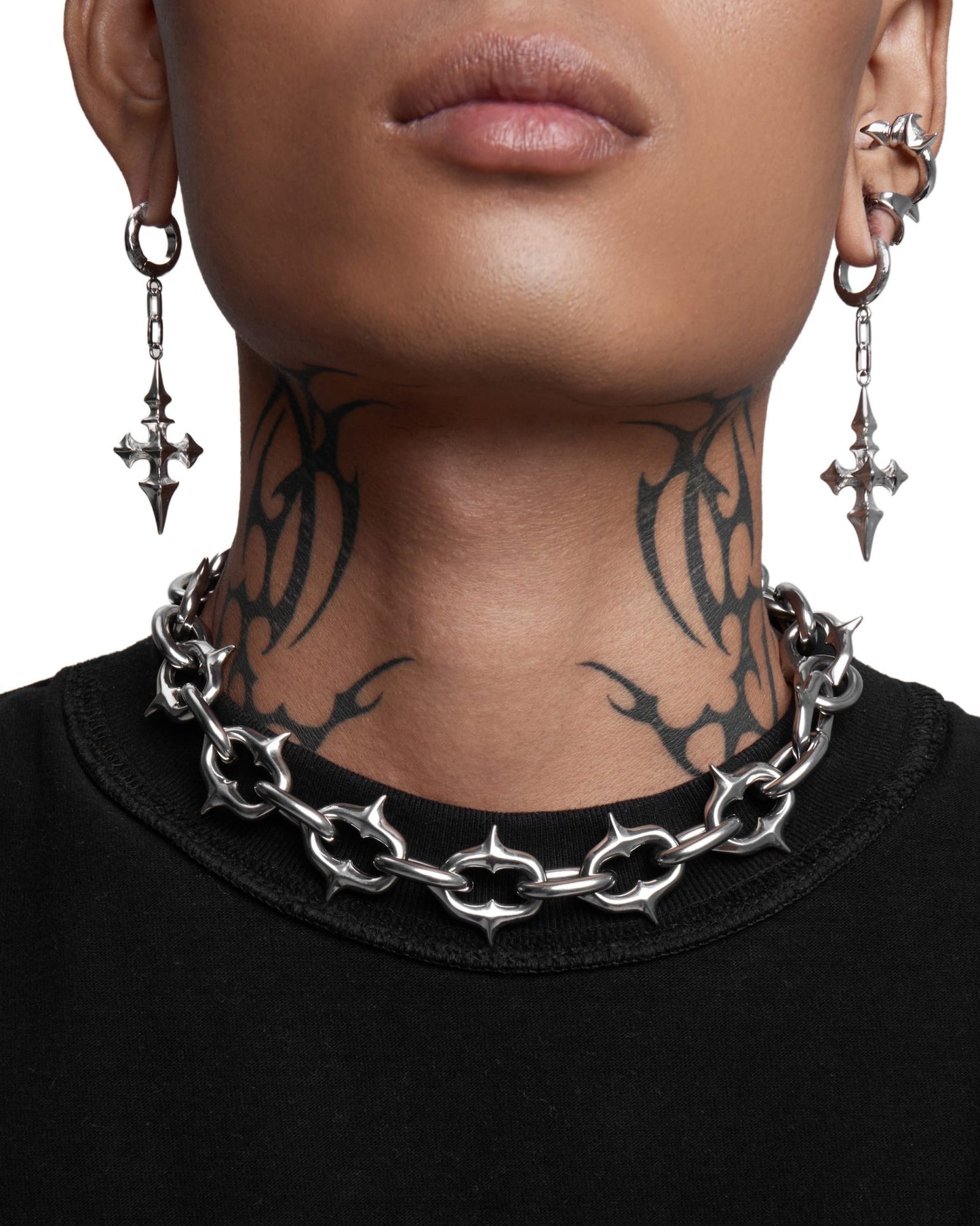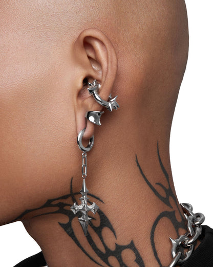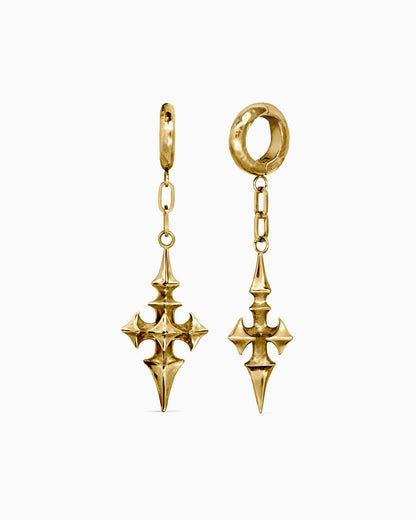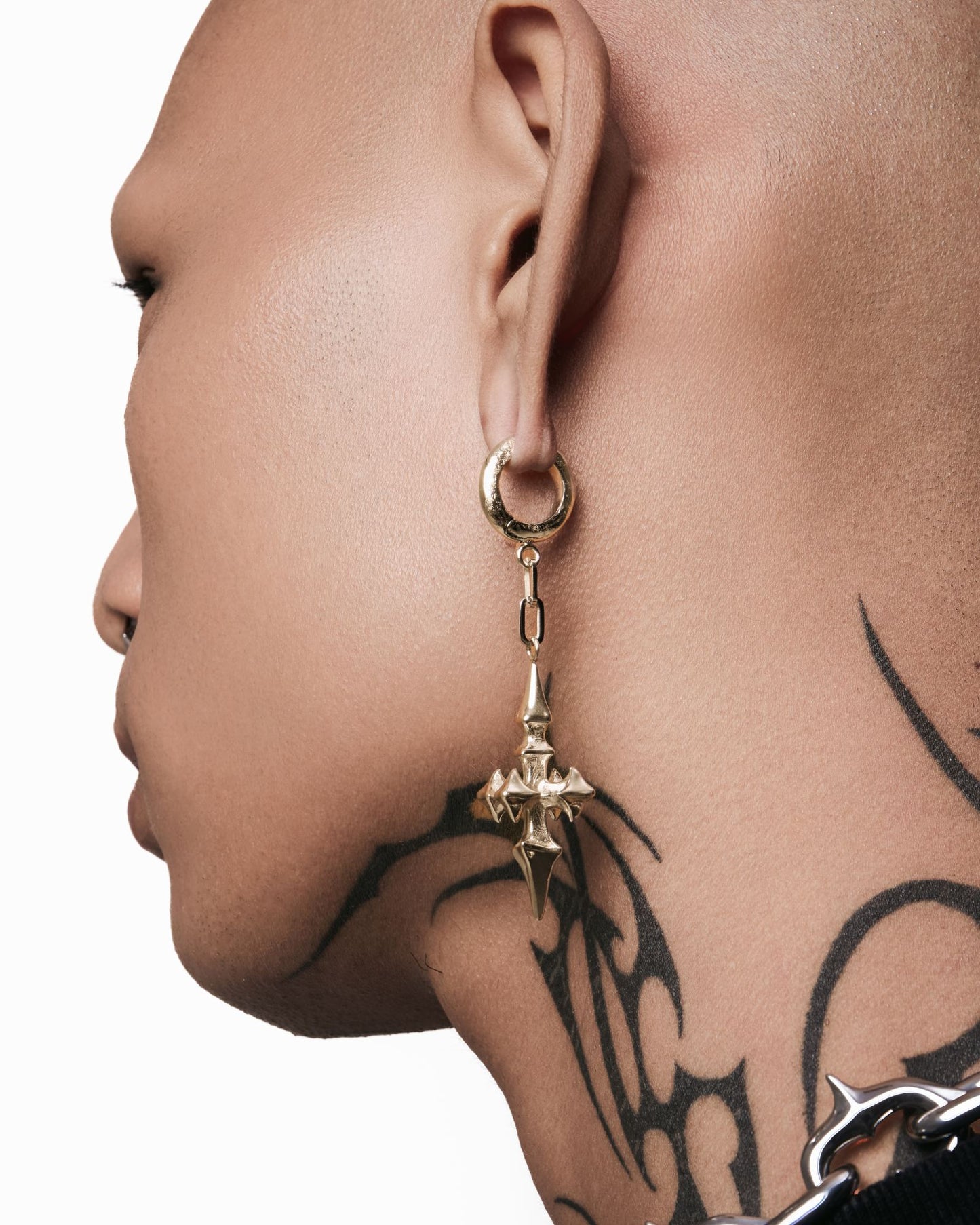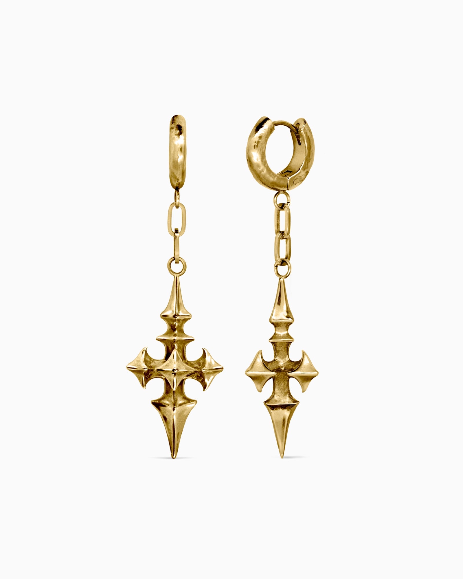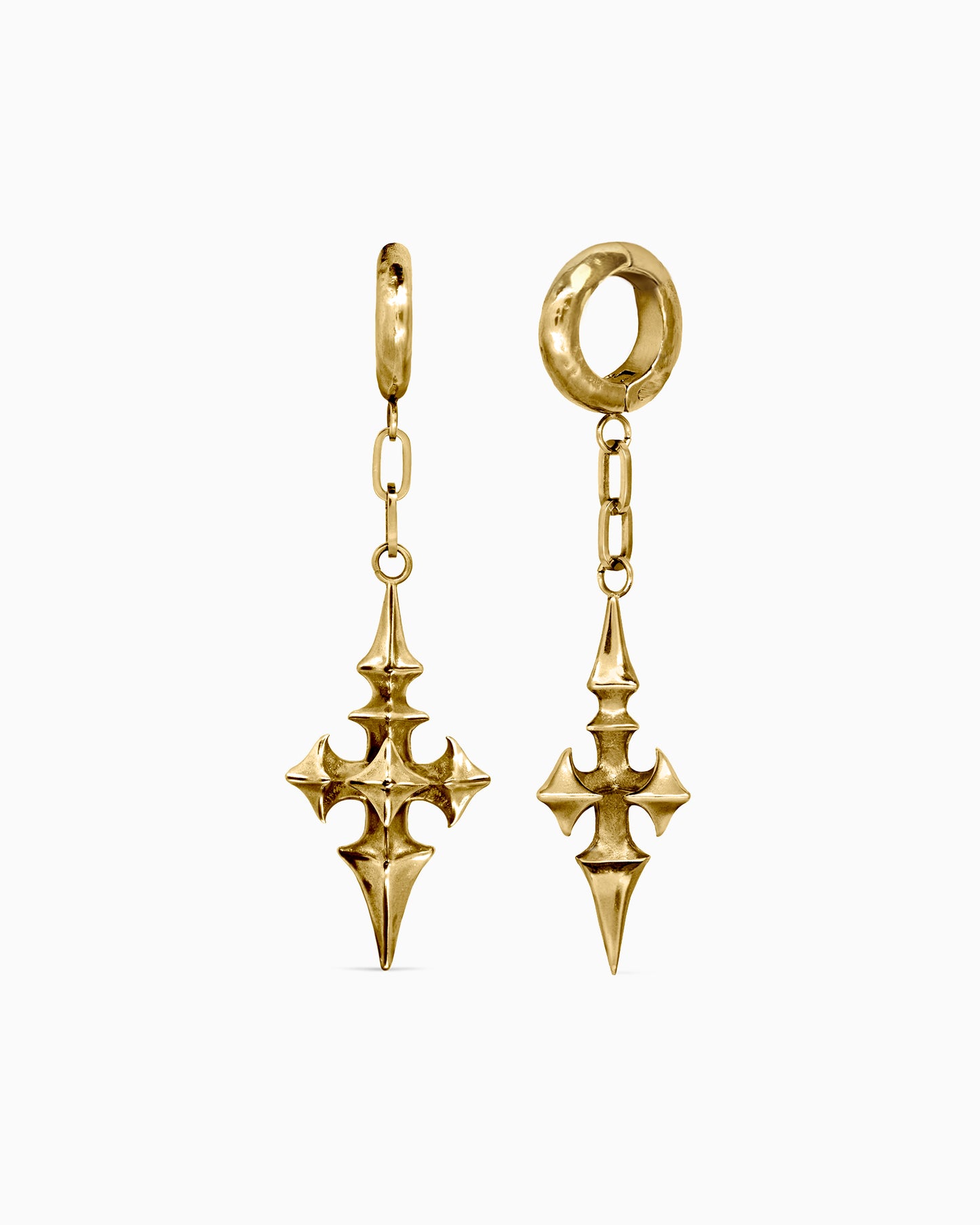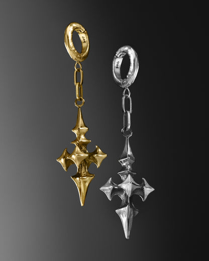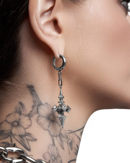 High-polished dangle hangers featuring a crossblight flail of spindled spikes, derived from the Ask & Embla gothic cross logomark. Forged entirely from 316L surgical grade stainless steel for all genders and expressions. Complete your look with other jewelry from the AELEGORIA series.