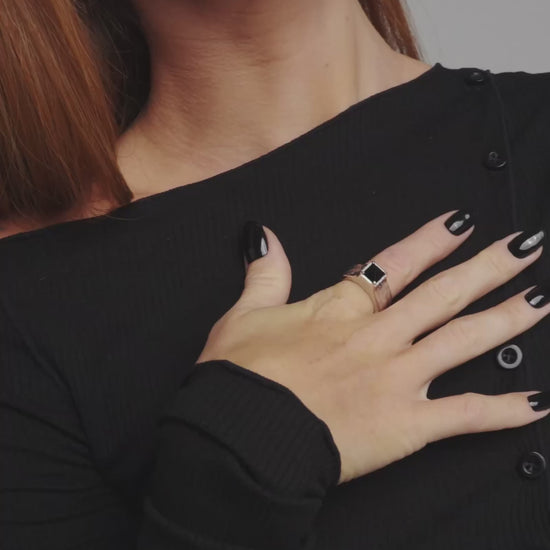 A bold, demi-fine 925 sterling silver ring set with a dark onyx gem, its shoulders etched with Sigil crosses from the Ask & Embla logomark.