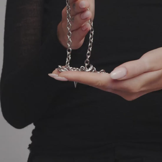 A choker chain necklace featuring a barbed bough pendant converging into a delicate v-point at its lowest arc. Fully adjustable—clasp at any link to customise your perfect fit. Forged entirely from 316L surgical grade stainless steel for all genders and expressions. Complete your look with other jewelry from the Elysian series.