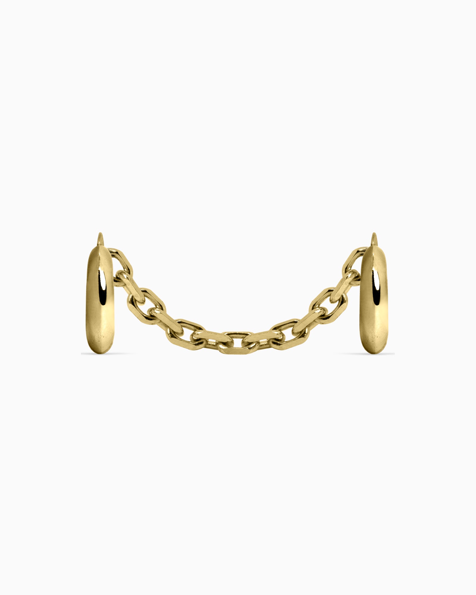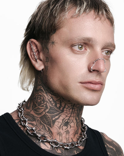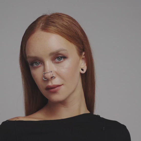 A demi-fine silver nose cuff featuring curved, talon-like hooks linked by a kinetic chain. This adjustable nose cuff requires no piercings. Pinch the hooks to shape before sliding them over the thinnest parts of your nostrils, then press gently for a secure, comfortable fit. Forged from 925 sterling silver for all genders and expressions. Complete your look with other jewelry from the FORSAKEN series.