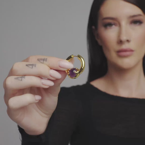 Hoop earrings with a spherical amethyst gemstone ensnared by molten tendrils. Forged for all genders and expressions. Ear posts made from 925 Silver - kinder to sensitive skin. Complete your look with other jewelry from the Nebula series.