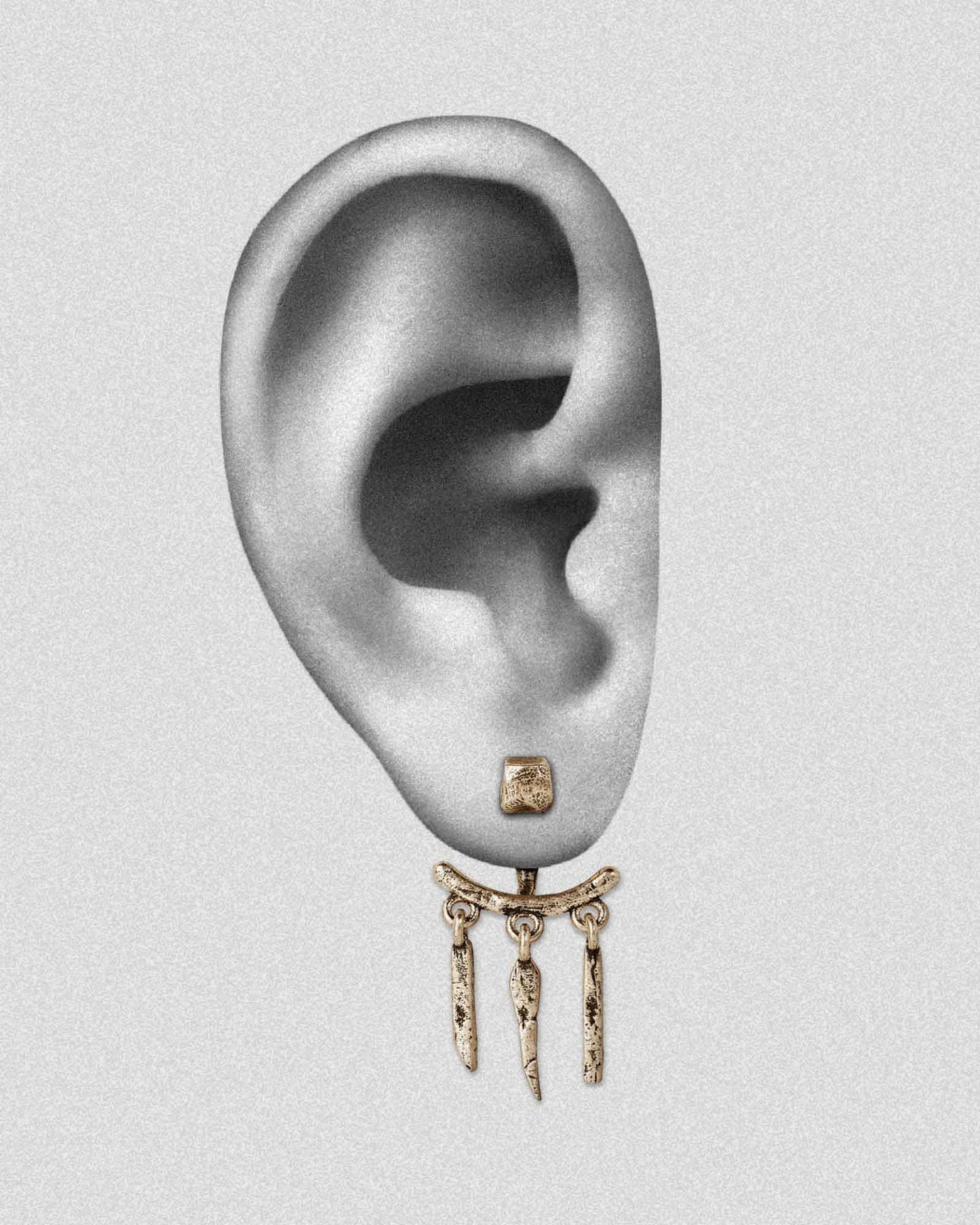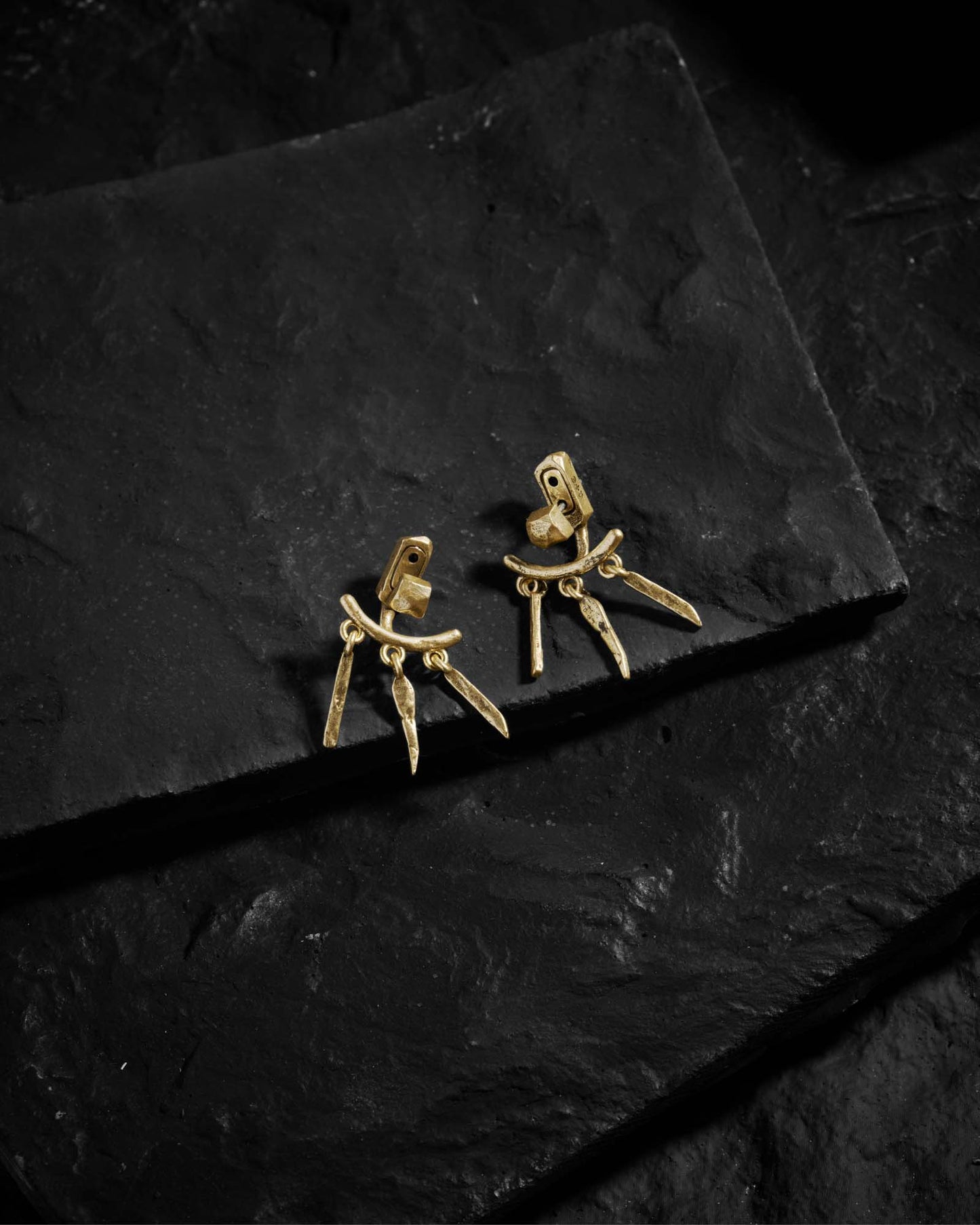 Stud earrings with decorative jacket backings linked to a curved bar that traces your lobe arc. The curved bar showcases three asymmetrical, organically textured stone fragments that move and mimic your sway. Ear posts made from 925 Silver - kinder to sensitive skin. Comes with custom-created post backings engraved with our A&E logo.