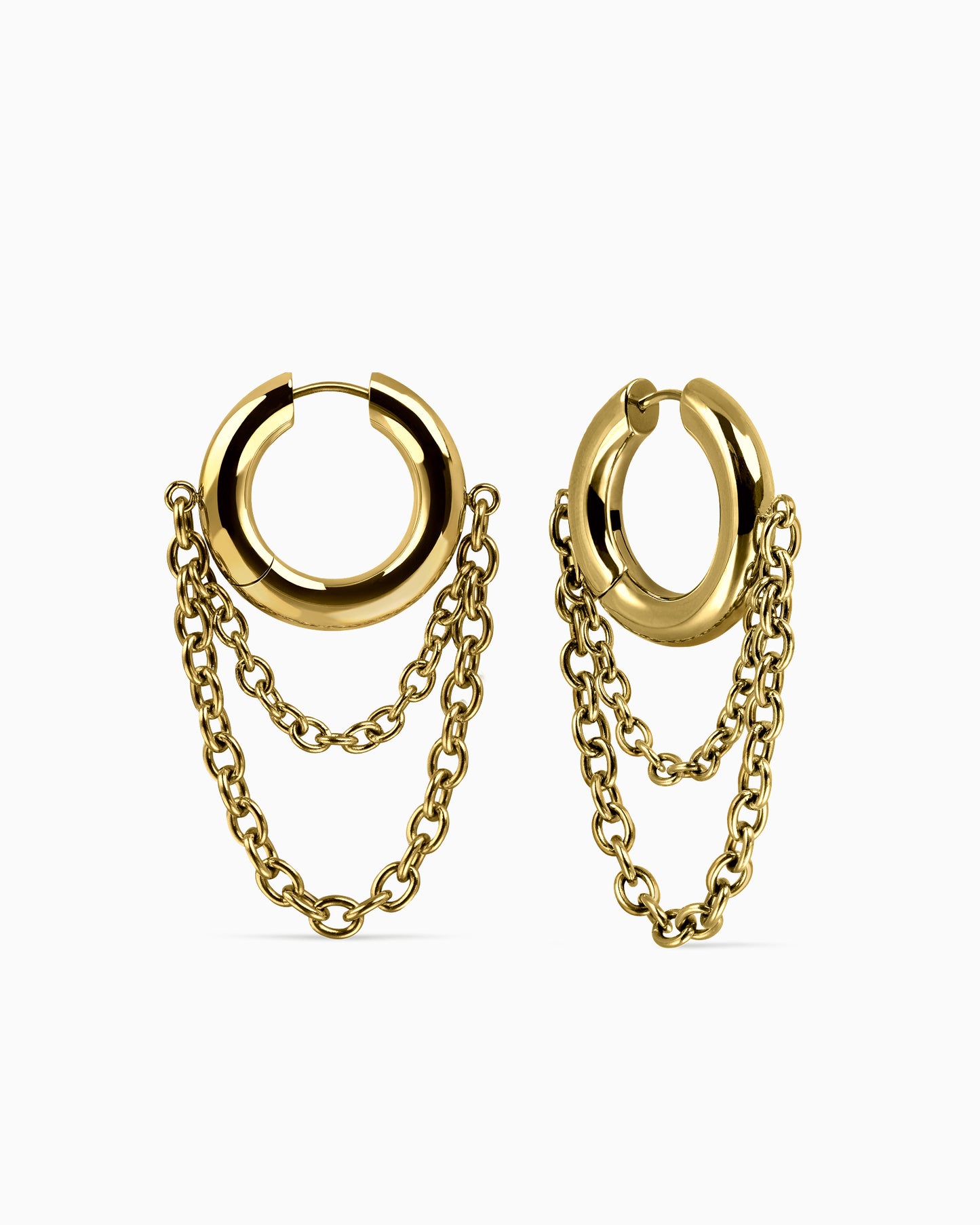 High-polished, bold hoop earrings featuring double-layered hanging chains, kinetically connected to mimic your sway. Forged entirely from 316L surgical grade stainless steel for all genders and expressions. Complete your look with other jewelry from the Obscura series.