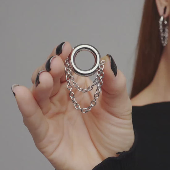 Hoop hangers featuring double-layered hanging chains, kinetically connected to mimic your sway. Forged entirely from 316L surgical grade stainless steel for all genders and expressions. Complete your look with other jewelry from the Obscura series.