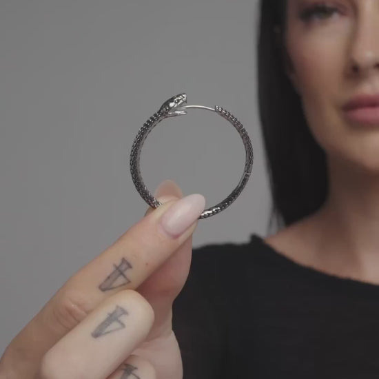 Hoop earrings, intricately detailed in the image of the ouroboros. Forged entirely from 316L surgical grade stainless steel for all genders and expressions. Complete your look with other jewelry from the Ouroboros series.