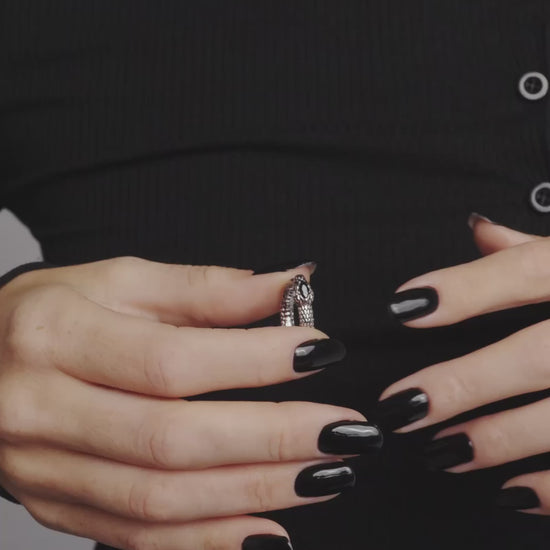 A 925 sterling silver ring intricately crafted in the image of the ouroboros, inlaid with a black cubic zirconia atop the serpent’s head. Forged for all genders and expressions. Complete your look with our Black Lake Serpent Ring, Sorcerer Serpent Ring or other jewelry from the Ouroboros series.