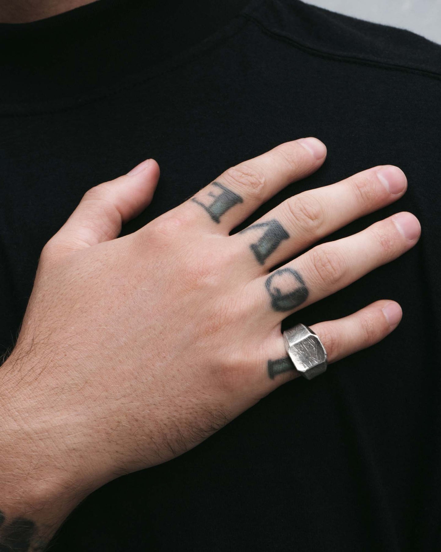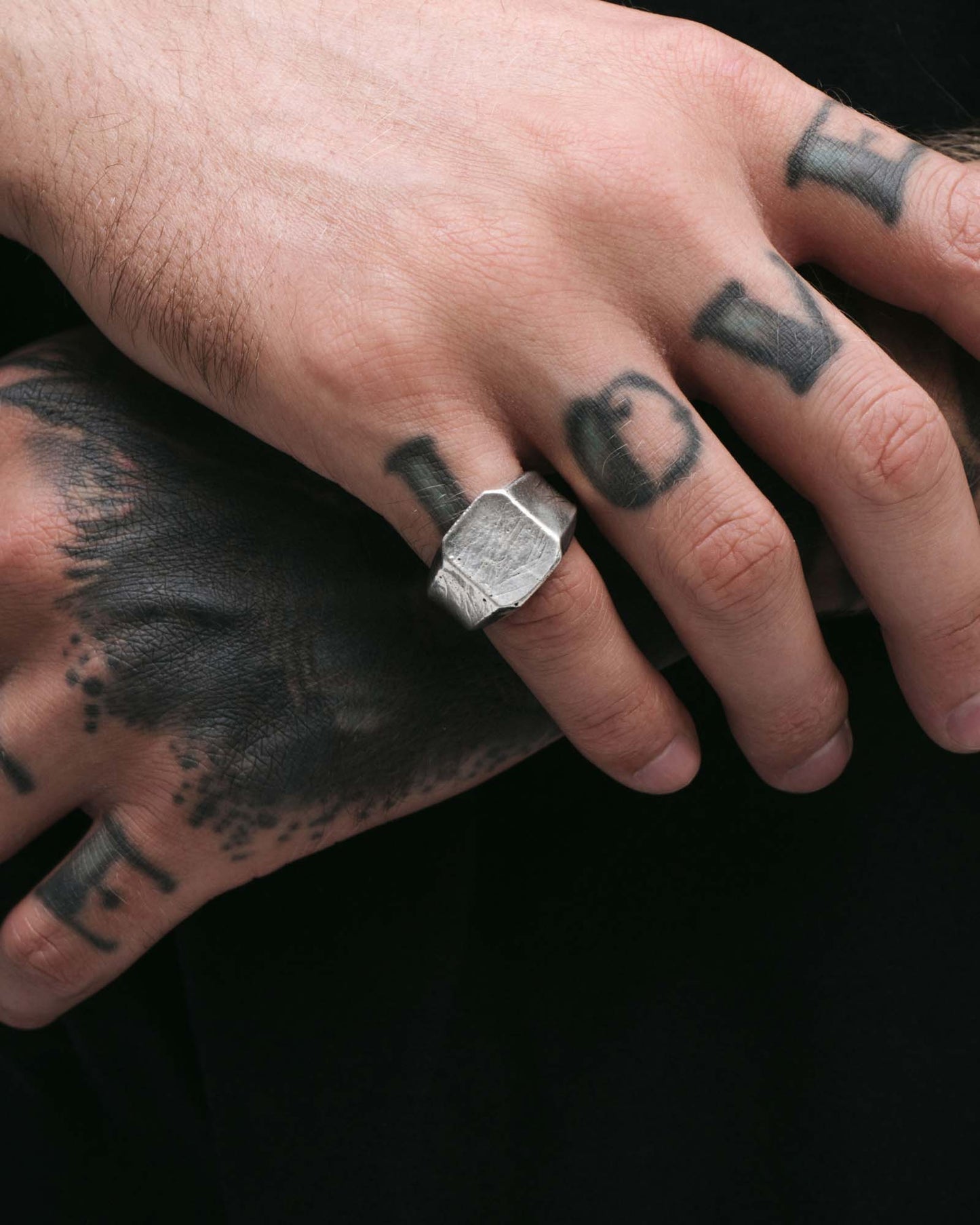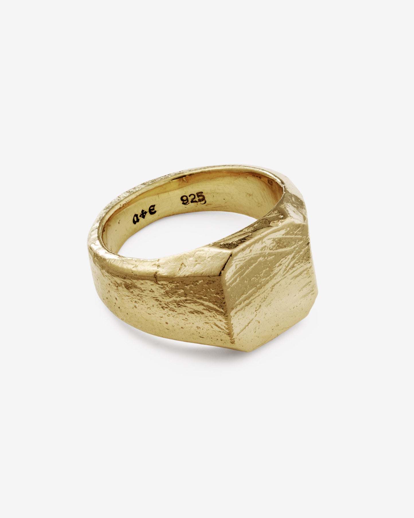 A 925 Sterling Silver signet ring surfaced with a time-worn texture. Bears an octagonal face. Demi-fine and forged for all genders and expressions.