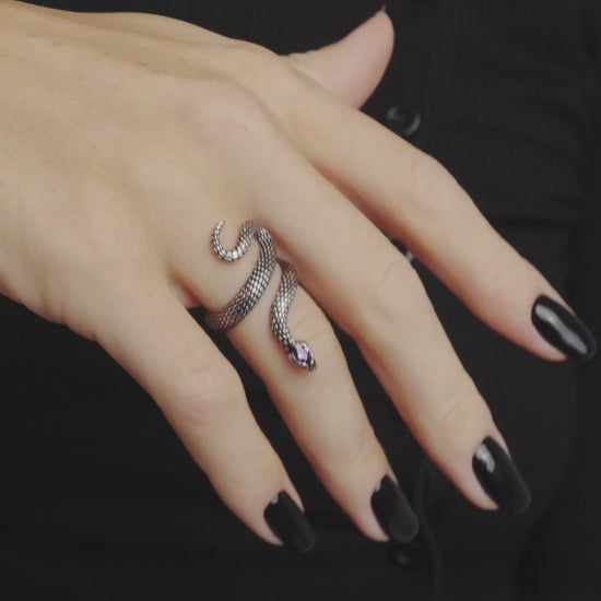A snake ring with a Black or Amethyst Cubic Zirconia stone inlaid on its head. Designed to coil around the finger like untamed energy.