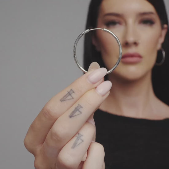Synthesis — Where elements merge, creation emerges.A fusion of ruggedness and refinement, our Synthesis Earrings No. 3 exude a polished, hand-forged, and uniquely tactile texture. Features a custom-made hoop body made of 316L stainless steel, providing a tarnish-free, hypoallergenic, waterproof, and durable adornment. Our Synthesis Earrings No. 3 are designed to keep charms secure, allowing for direct charm attachment with or without clasps.